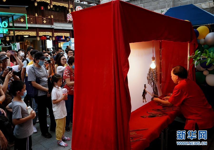 7月3日,游人在上海豫園中心廣場(chǎng)上觀看皮影表演。從7月第一個(gè)周末起,上海豫園原有的“豫園六點(diǎn)半”集市全面升級(jí),煥彩燈光、演藝活動(dòng)和花車集市全線更新,讓市民和游客在觀燈、觀人、觀演的沉浸式體驗(yàn)中,享受夏日特色的“食玩”樂趣。新華社記者 劉穎 攝