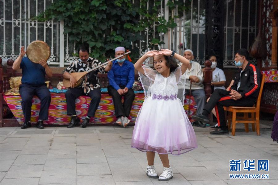 在烏魯木齊大巴扎景區(qū),小朋友跟著音樂起舞(7月4日攝)。夏日周末,烏魯木齊市大巴扎景區(qū)內(nèi)熙熙攘攘,人們來到這里品嘗美食、休閑購物。2018年,經(jīng)過靚化改造后的大巴扎景區(qū)新增長約800米的步行街,分為文創(chuàng)文旅和“非遺”項(xiàng)目街區(qū)、國際時(shí)尚街區(qū)和大巴扎美食街區(qū),是烏魯木齊最受歡迎的旅游目的地之一。新華社記者丁磊攝