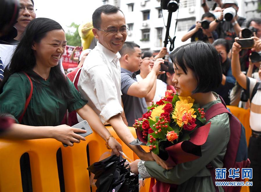 7月8日,一名考生(右)在湖南省長沙市一中考點(diǎn)外從家長手中接過鮮花。當(dāng)日,全國部分地區(qū)2020年高考結(jié)束。新華社記者薛宇舸攝