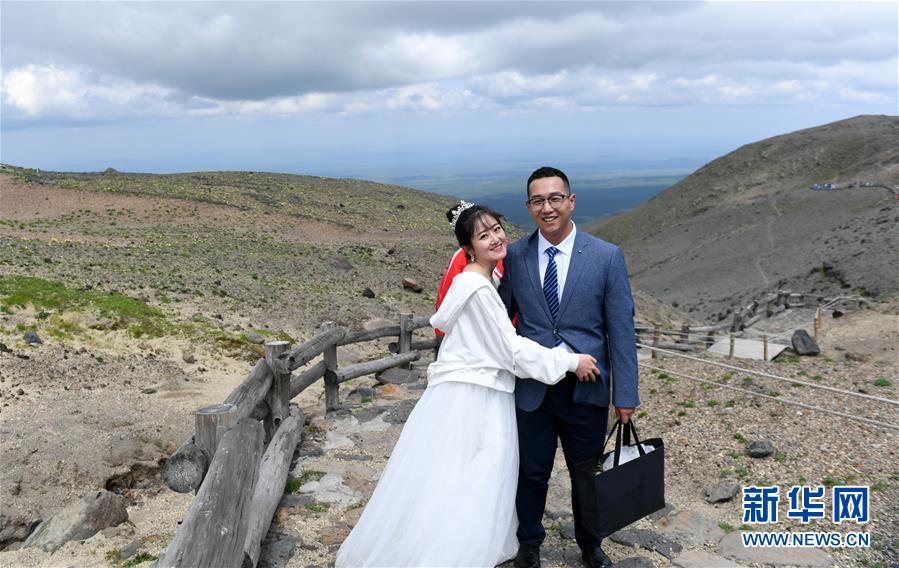 7月8日,一對(duì)新人在長白山北景區(qū)主峰上拍照。新華社記者林宏攝