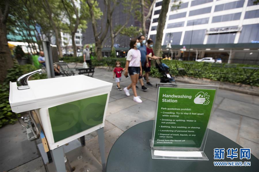 7月8日,行人從美國紐約布萊恩特公園的洗手設(shè)施旁經(jīng)過。美國約翰斯·霍普金斯大學8日發(fā)布的新冠疫情最新統(tǒng)計數(shù)據(jù)顯示,美國累計確診病例超過300萬例。數(shù)據(jù)顯示,截至美國東部時間8日11時34分(北京時間23時34分),美國累計確診病例3016515例,累計死亡病例131594例。新華社記者王迎攝