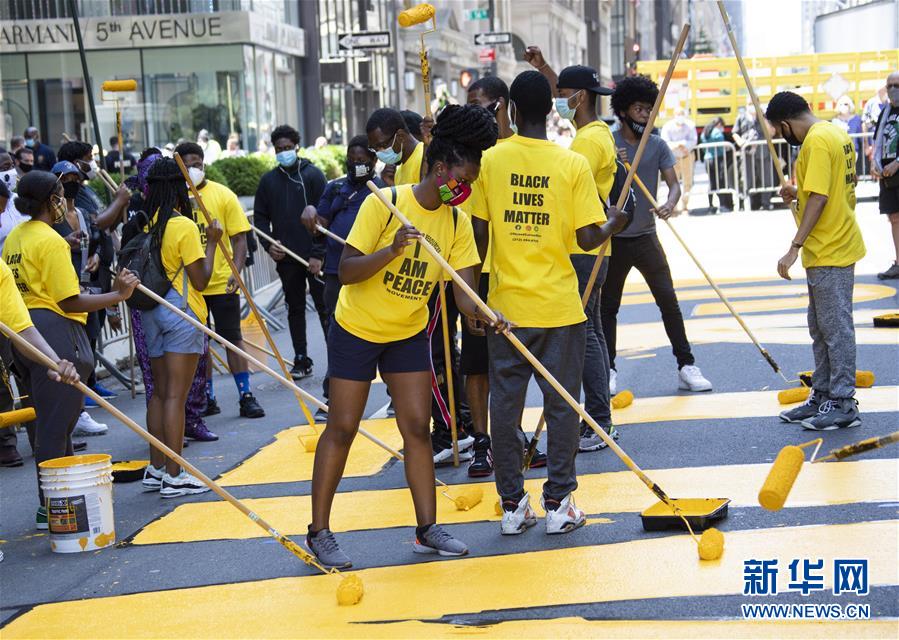 7月9日,在美國紐約第五大道特朗普大廈前,人們涂寫“黑人的命也是命”標(biāo)語。當(dāng)天,數(shù)十人在紐約第五大道特朗普大廈前的路面上涂寫“黑人的命也是命”標(biāo)語。紐約市計劃在多處地點(diǎn)涂寫“黑人的命也是命”標(biāo)語。新華社記者王迎攝