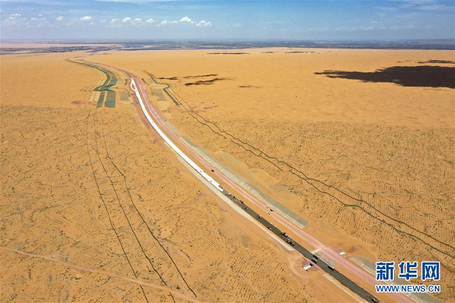 7月10日,位于寧夏境內(nèi)的烏瑪高速青銅峽至中衛(wèi)段A10標段在施工中(無人機照片)。盛夏時節(jié),位于寧夏境內(nèi)的烏瑪(內(nèi)蒙古烏海市至青?,斍呖h)高速青銅峽至中衛(wèi)段正在抓緊施工建設(shè)。該路段主線全長122.9公里,其中穿越騰格里沙漠腹地的18公里公路是寧夏建設(shè)的首條沙漠高速公路,預計2021年建成通車。新華社記者馮開華攝。