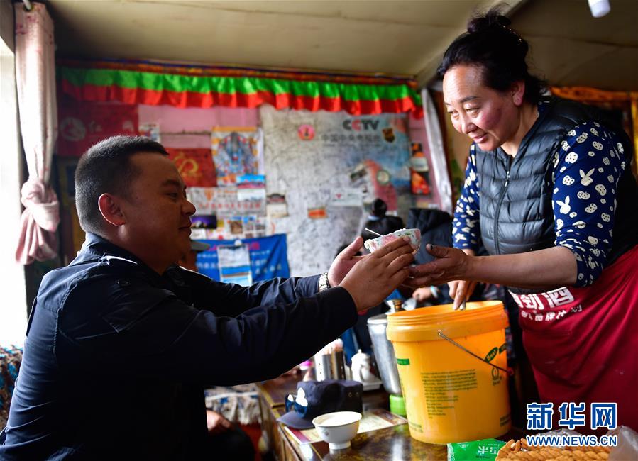 在可可西里不凍泉保護(hù)站周邊牧民家休息時(shí),當(dāng)?shù)啬撩窠o龍周才加準(zhǔn)備酸奶(6月29日攝)。新華社記者 張龍 攝