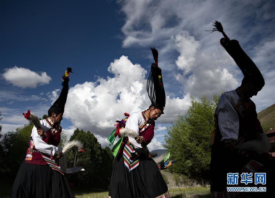 尼瑪老人的弟子們?cè)诒硌荨熬煤幼课琛保?月1日攝)。新華社記者普布扎西攝