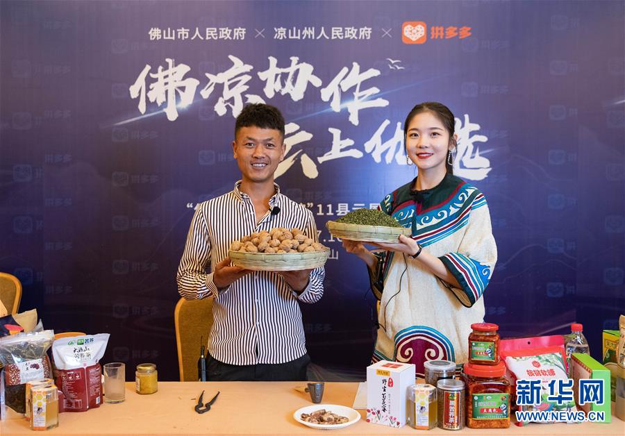 7月18日,在涼山州昭覺縣粵川東西部扶貧協(xié)作項(xiàng)目產(chǎn)業(yè)園,昭覺縣縣長(zhǎng)赫紹洪(右)在直播活動(dòng)中向網(wǎng)友推薦農(nóng)特產(chǎn)品。新華社記者江宏景攝