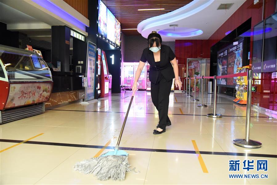 7月20日,濟南新世紀電影城陽光100店的員工在對影院設(shè)施進行消殺。當日,山東濟南市部分電影院在嚴格防控疫情的基礎(chǔ)上陸續(xù)恢復(fù)開放。新華社記者王凱攝