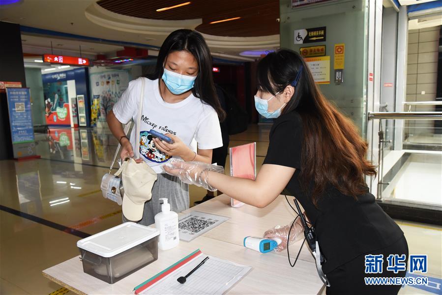 7月20日,濟(jì)南新世紀(jì)電影城陽(yáng)光100店的員工(右)在核對(duì)觀眾的健康碼。當(dāng)日,山東濟(jì)南市部分電影院在嚴(yán)格防控疫情的基礎(chǔ)上陸續(xù)恢復(fù)開放。新華社記者王凱攝