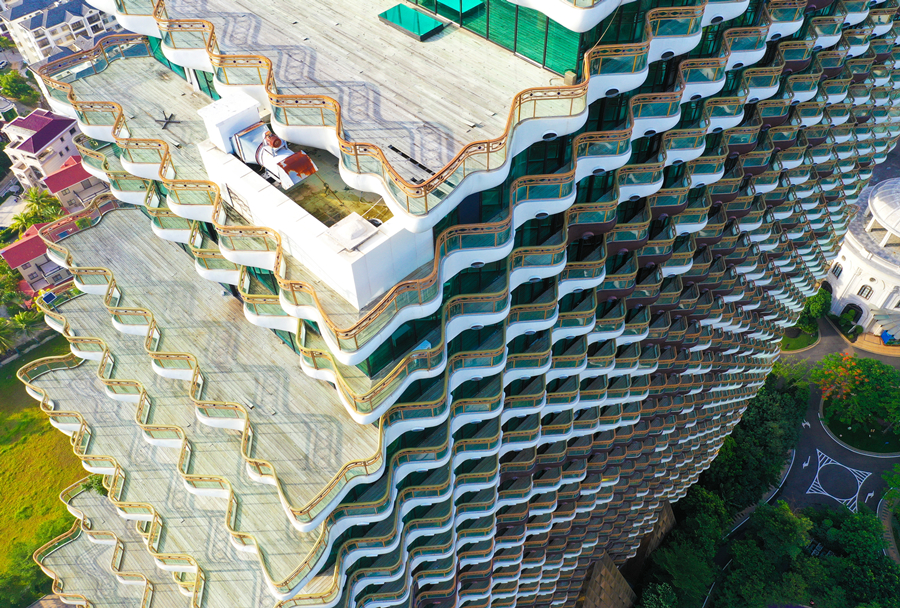 2020年7月20日,海南省三亞市,圖為航拍的“九棵大樹”建筑群。建筑物陽臺(tái)均為波浪形,視野良好,契合三亞“?!钡膶傩浴?/p>