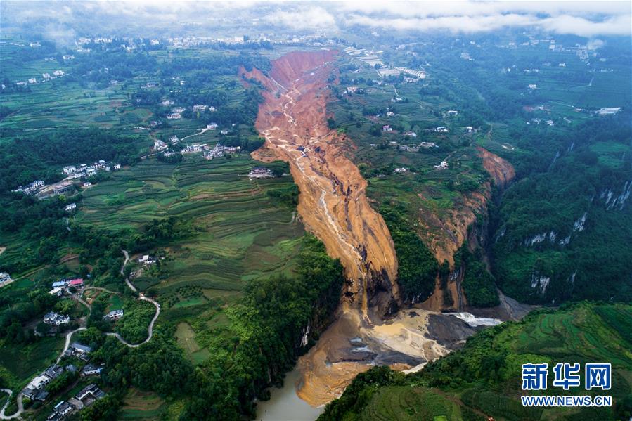 7月22日拍攝的因恩施州屯堡鄉(xiāng)馬者村山體滑坡形成的堰塞湖(無人機(jī)照片)。新華社記者肖藝九攝