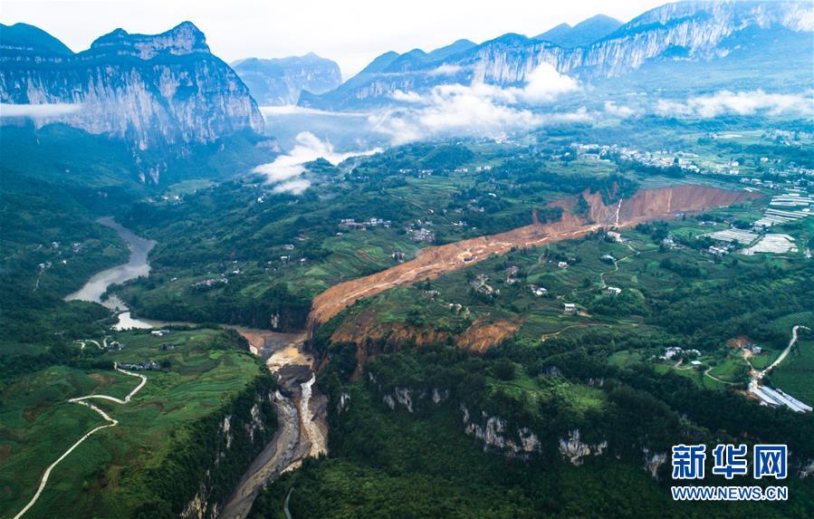 7月22日拍攝的因恩施州屯堡鄉(xiāng)馬者村山體滑坡形成的堰塞湖(無(wú)人機(jī)照片)。新華社記者肖藝九攝
