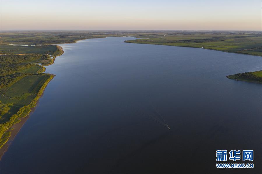 7月24日,漁民在大力加湖中捕魚(無人機照片)。大力加湖位于“中國東極”黑龍江省撫遠市,面積28.5平方公里,兩岸地勢低平,多濕地、草原,湖內水產豐富。夏日傍晚時分,漁民捕魚歸來,美麗畫卷映入眼簾。新華社記者謝劍飛攝