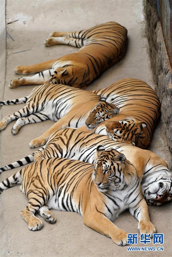 7月28日,在橫道河子?xùn)|北虎林園,東北虎在休息。時(shí)值盛夏,位于黑龍江省海林市的橫道河子?xùn)|北虎林園的東北虎活動(dòng)量減少,以不同方式消夏納涼。新華社記者王建威攝
