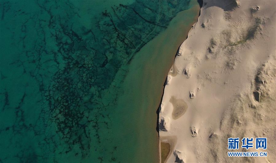 這是青海湖沙島風光(7月28日攝,無人機照片)。盛夏傍晚,位于青海湖東北部的沙島,島內湖泊星羅棋布,沙丘連綿起伏,風景別致。金沙與湖水掩映,在陽光的勾勒下形成一幅美麗的畫卷。新華社記者張宏祥攝
