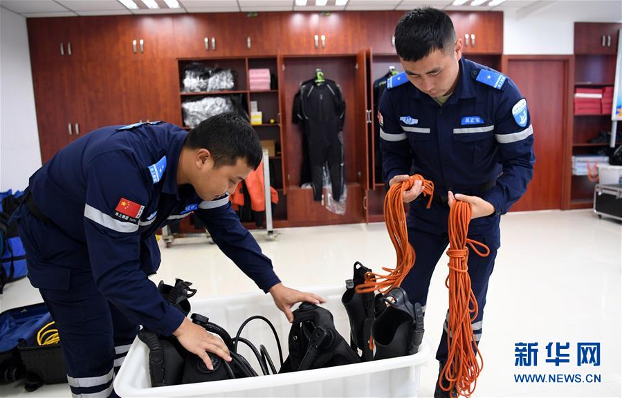 7月25日,在合肥市公安局水上分局蛙人中隊(duì)駐地,徐宏林(左)和吳正寶在整理潛水裝備。新華社記者白斌攝