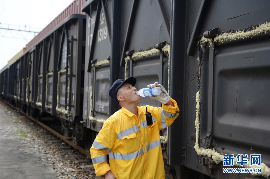 8月6日,合肥運用車間列車檢修員在工作間隙喝水。合肥市近日持續(xù)高溫天氣。在中國鐵路上海局集團有限公司杭州北車輛段合肥運用車間,386名列車檢修工人頭頂烈日堅守崗位,確保暑運列車的安全運行。據(jù)了解,暑運期間,合肥運用車間日均檢修列車105列,檢修車廂5058節(jié)。新華社記者黃博涵攝