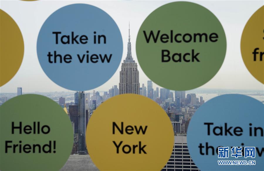 這是8月6日在美國紐約洛克菲勒中心觀景臺上拍攝的城市景觀。當(dāng)日,3月份暫時關(guān)閉的洛克菲勒中心觀景臺恢復(fù)對公眾開放。每天13時至21時,人們可戴口罩前往參觀。新華社記者王迎攝