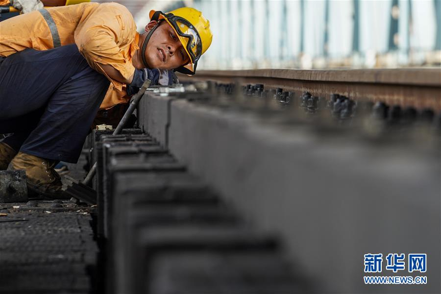 8月6日,橋隧工郭繼浩在南京長江大橋作業(yè)點安裝護木螺桿。新華社記者李博攝