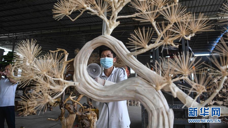 8月7日,工人在制作根雕工藝品。2017年以來,廣西桂林市永??h永安鄉(xiāng)通過幫扶返鄉(xiāng)青年創(chuàng)業(yè)的方式,建立起根雕工藝品就業(yè)扶貧車間,組織貧困群眾進車間務(wù)工學(xué)藝,把當(dāng)?shù)刎S富的朽木和柑橘樹根枝資源利用起來,加工成盆景、茶桌、吊燈等根雕工藝品,不僅幫助貧困群眾在家門口掌握一技之長,還讓他們在脫貧摘帽后實現(xiàn)穩(wěn)定增收。新華社記者張愛林?jǐn)z