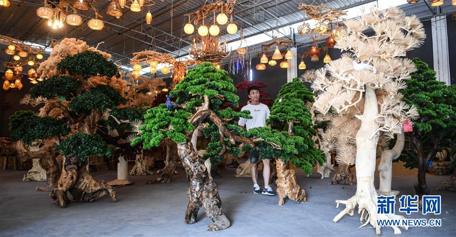 這是8月7日在永??h永安鄉(xiāng)根雕工藝品就業(yè)扶貧車間拍攝的根雕工藝品。2017年以來,廣西桂林市永??h永安鄉(xiāng)通過幫扶返鄉(xiāng)青年創(chuàng)業(yè)的方式,建立起根雕工藝品就業(yè)扶貧車間,組織貧困群眾進車間務(wù)工學藝,把當?shù)刎S富的朽木和柑橘樹根枝資源利用起來,加工成盆景、茶桌、吊燈等根雕工藝品,不僅幫助貧困群眾在家門口掌握一技之長,還讓他們在脫貧摘帽后實現(xiàn)穩(wěn)定增收。新華社記者張愛林攝