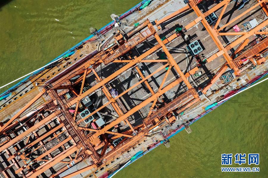 8月9日拍攝的廣州南沙港鐵路跨西江特大斜拉橋最后一塊鋼箱梁吊裝施工現(xiàn)場(chǎng)(無人機(jī)照片)。當(dāng)日,中鐵十一局承建的粵港澳大灣區(qū)基礎(chǔ)設(shè)施“硬聯(lián)通”重點(diǎn)工程——廣州南沙港鐵路跨西江特大斜拉橋完成最后一塊鋼箱梁吊裝作業(yè),大橋即將合龍。該橋位于廣東佛山市和江門市交界處,全長(zhǎng)1117.5米。新華社記者劉大偉攝。