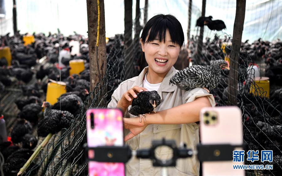 陜西商洛市丹鳳縣寺坪鎮(zhèn)寺坪村的網(wǎng)絡(luò)主播李萌在直播介紹自家養(yǎng)的蘆花雞(7月20日攝)。陜西丹鳳縣位于秦嶺東段南麓,依山傍水、農(nóng)特產(chǎn)品豐富。近年來(lái),隨著網(wǎng)絡(luò)銷售模式的興起,當(dāng)?shù)胤e極培育壯大“本土網(wǎng)紅”隊(duì)伍,通過(guò)網(wǎng)絡(luò)直播、線上銷售、線下配送等形式,助力秦嶺山區(qū)優(yōu)質(zhì)農(nóng)產(chǎn)品走出大山,帶動(dòng)百姓增收致富。新華社記者劉瀟攝。