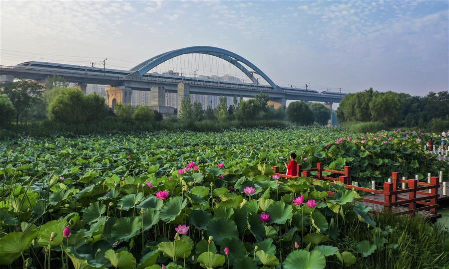 市民在唐山市豐南區(qū)人民公園欣賞荷花(7月25日攝,無人機(jī)照片)。近年來,河北省唐山市豐南區(qū)全力推動(dòng)“全域治水、清水潤(rùn)城”工程,形成了以唐津運(yùn)河、人民公園生態(tài)廊道等以健身、休閑、旅游功能于一體的人水相親、城水相依的景觀環(huán)境,為綠色發(fā)展注入活力。新華社記者楊世堯攝。
