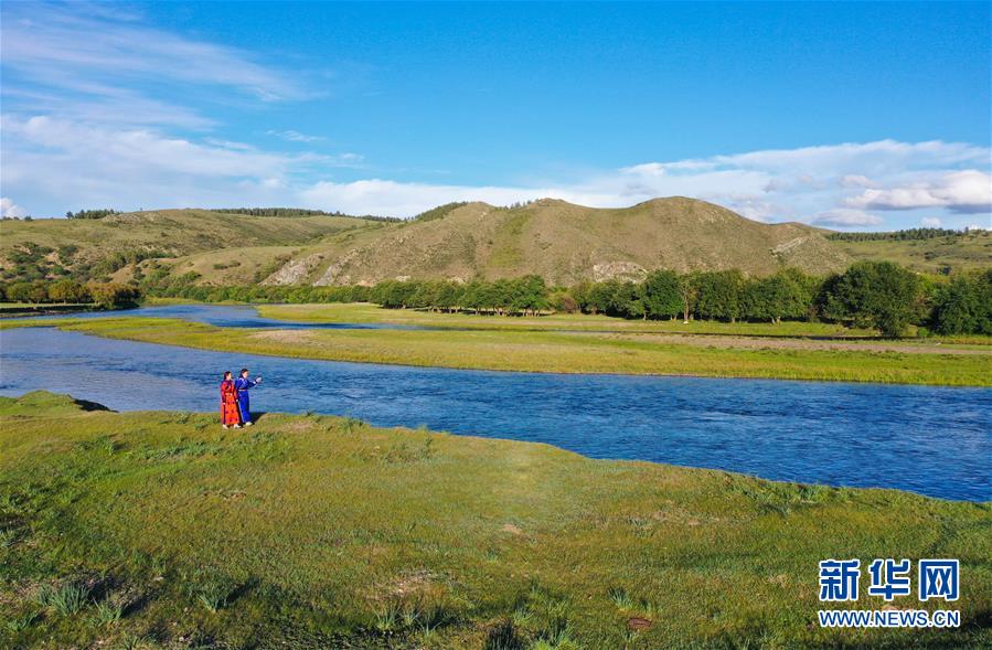 在內(nèi)蒙古自治區(qū)鄂溫克族自治旗伊敏蘇木,艾吉瑪(左)和母親烏仁在伊敏河邊散步(8月6日攝,無人機照片)。新華社記者徐欽攝。