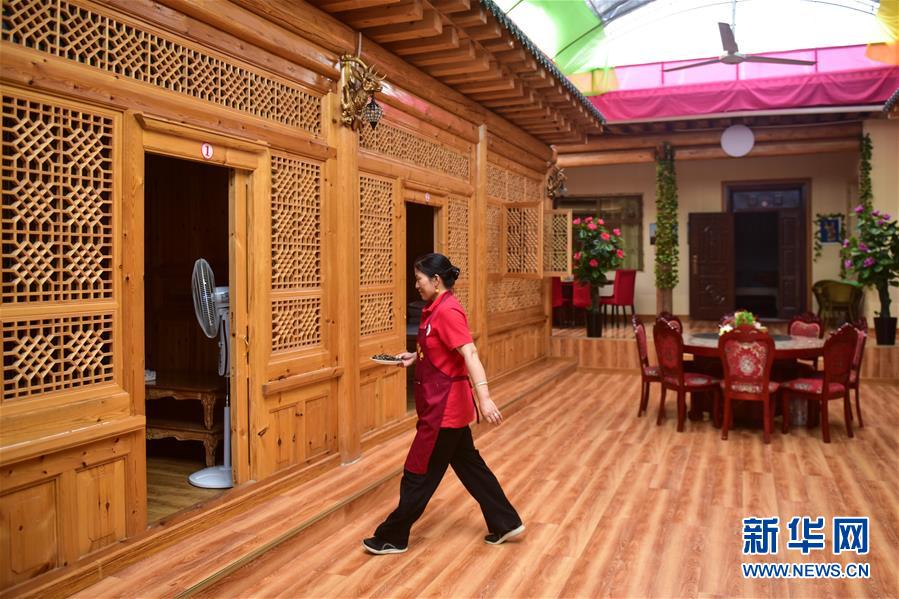 8月11日,尖扎縣昂拉鄉(xiāng)德吉村村民角巴措在自家民宿內(nèi)為旅客送食品。新華社記者張龍攝