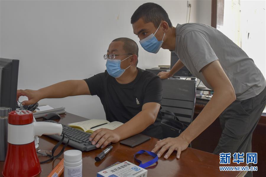 8月12日,烏魯木齊市天山區(qū)山西巷社區(qū)工作人員王志鷹(左)與同事溝通工作事宜。新華社記者 高晗 攝