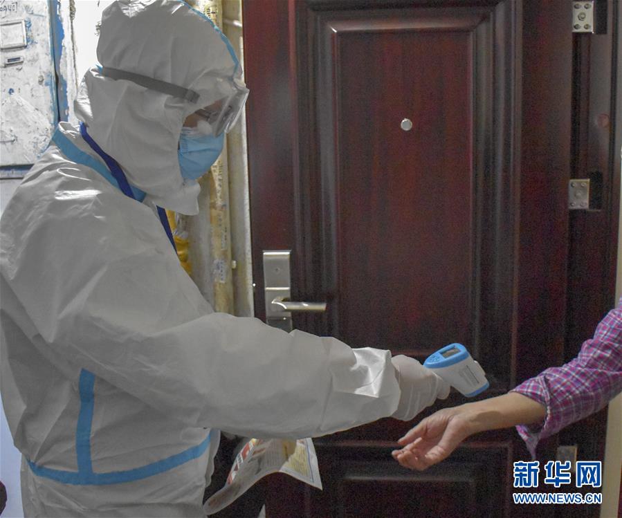8月12日,烏魯木齊市天山區(qū)山西巷社區(qū)工作人員王志鷹(左)上門(mén)為居家居民測(cè)量體溫。新華社記者 高晗