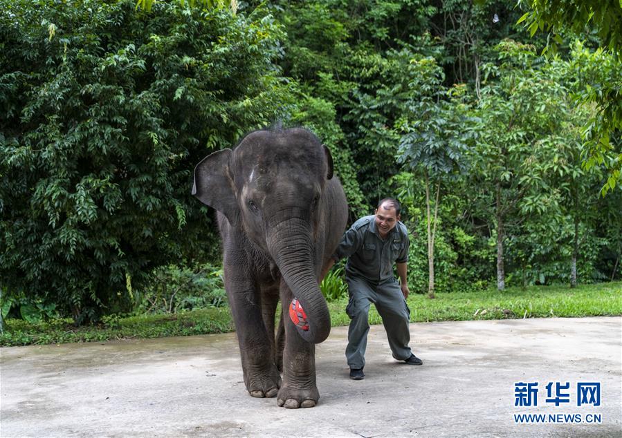 8月12日,在西雙版納傣族自治州亞洲象種源繁育及救助中心,救助象“羊妞”在生日會(huì)上與一名“象爸爸”玩皮球。