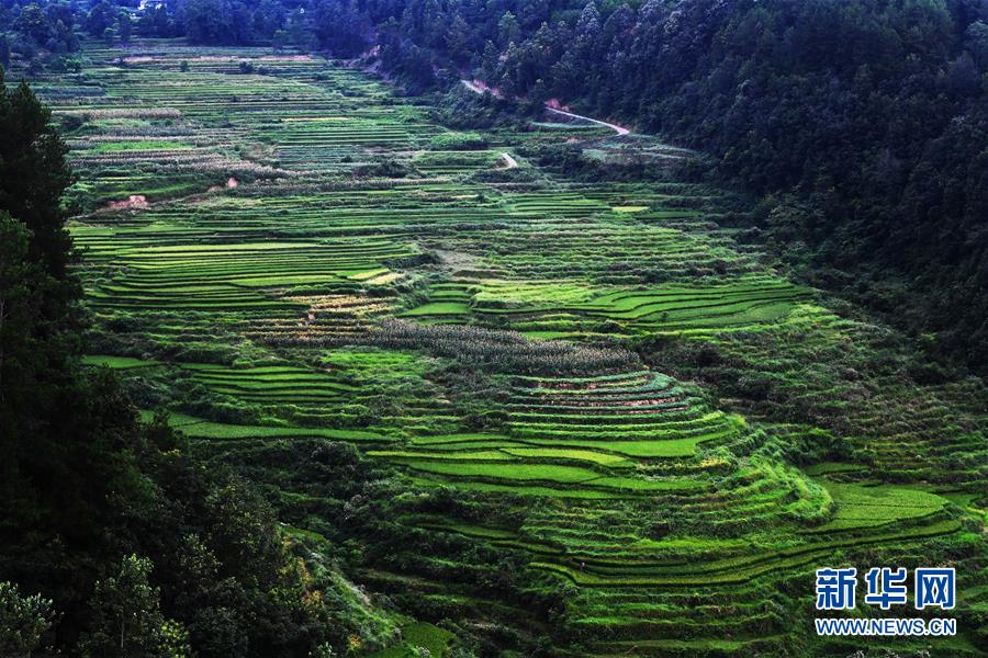 這是8月13日拍攝的鞍子鎮(zhèn)大林村梯田景色。時(shí)下,重慶市彭水苗族土家族自治縣鞍子鎮(zhèn)大林村的梯田景色迷人,構(gòu)成一幅幅山鄉(xiāng)田園美景。新華社記者王全超攝