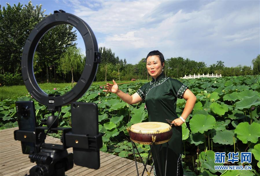 8月13日,河北省河間市西河大鼓非遺項目藝人李雪通過網(wǎng)絡直播表演西河大鼓。暑假期間,河北省河間市文化館推出非遺展演“云端”播系列活動,組織當?shù)匚骱哟蠊姆沁z項目傳承人利用視頻直播的方式進行線上展演,通過“云端”傳承非遺文化。新華社記者朱旭東攝