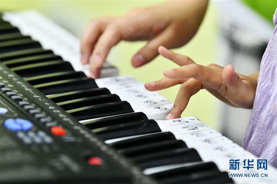 8月13日,在貴州省思南縣雙塘街道麗景社區(qū)易地扶貧搬遷安置點,志愿者在指導孩子學彈電子琴。新華社記者楊文斌攝