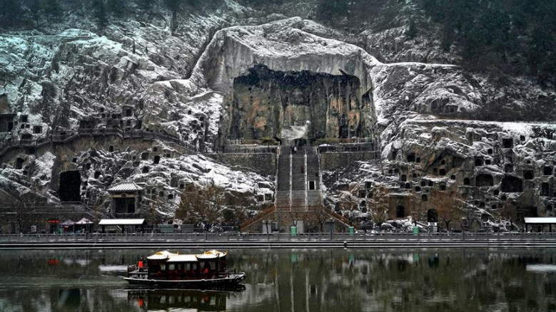 當(dāng)日,雪后的河南洛陽(yáng)龍門石窟景區(qū)銀裝素裹,一幅天然的水墨畫卷徐徐展開。