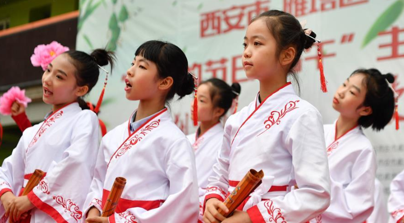 當(dāng)日,陜西師范大學(xué)附屬小學(xué)在位于西安的校園里舉行傳統(tǒng)民俗活動(dòng)迎接即將到來的端午節(jié)。