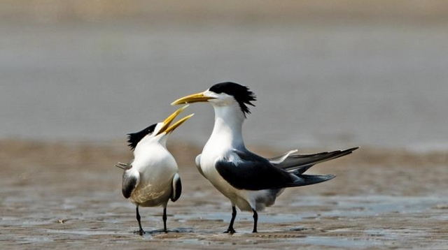 眼下正是大鳳頭燕鷗繁育的時節(jié),在福建閩江河口濕地核心區(qū)鱔魚灘的沙洲上,大鳳頭燕鷗正相互嬉戲。