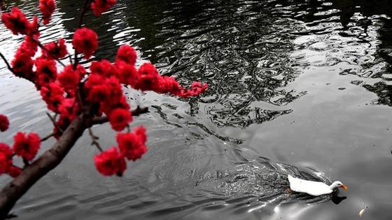 北京居庸關(guān)桃花盛開 列車穿行其中
