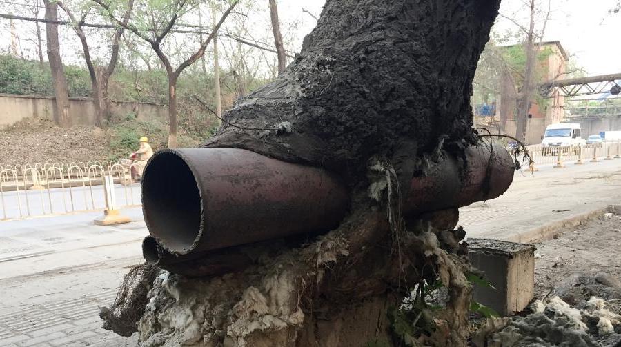 附近居民介紹,這棵大樹樹齡有二三十年。樹中包裹的鐵管是早于大樹架設(shè)的管道。大樹在生長過程中,樹干慢慢地把兩根鐵管包裹了進(jìn)去。