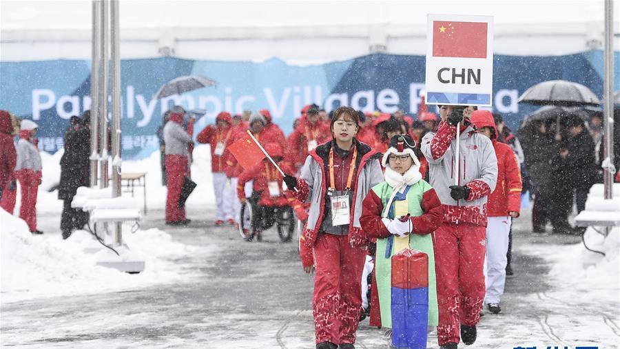 當日,2018年平昌冬殘奧會中國體育代表團升旗儀式在韓國平昌運動員村舉行。