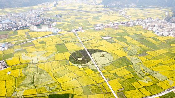貴州黔南凱口鎮(zhèn),春暖花開,隨著氣溫逐漸升高,千畝油菜花田盛開,呈現出布依族青年男女圍繞太極圖的畫面。