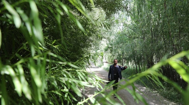 甘肅省金昌市永昌縣下四壩村村民徐文國走在林間小道上,兩旁的樹都是他15年前栽的(7月10日攝)。