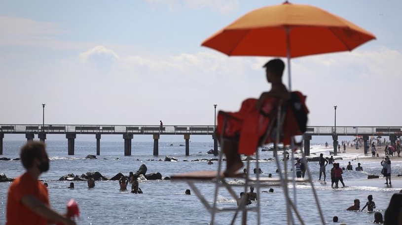 7月1日,救生員在美國紐約科尼島的一處海灘查看海面情況。當日,美國紐約市屬八處海灘正式重新準許民眾游泳,救生員也同時上崗。