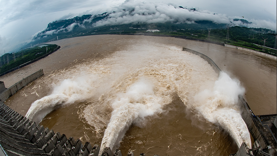 2020年7月2日,湖北宜昌,長江三峽樞紐開啟泄洪深孔泄洪。