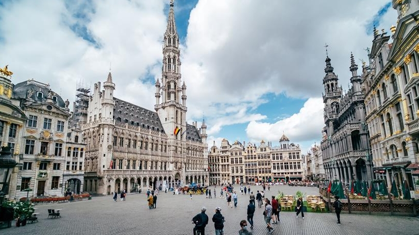 6月28日,兩名來(lái)自英國(guó)的游客在比利時(shí)布魯塞爾大廣場(chǎng)游覽。