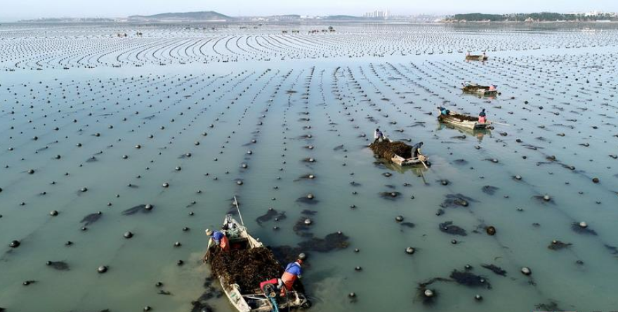 場面壯觀!山東威海收割海帶