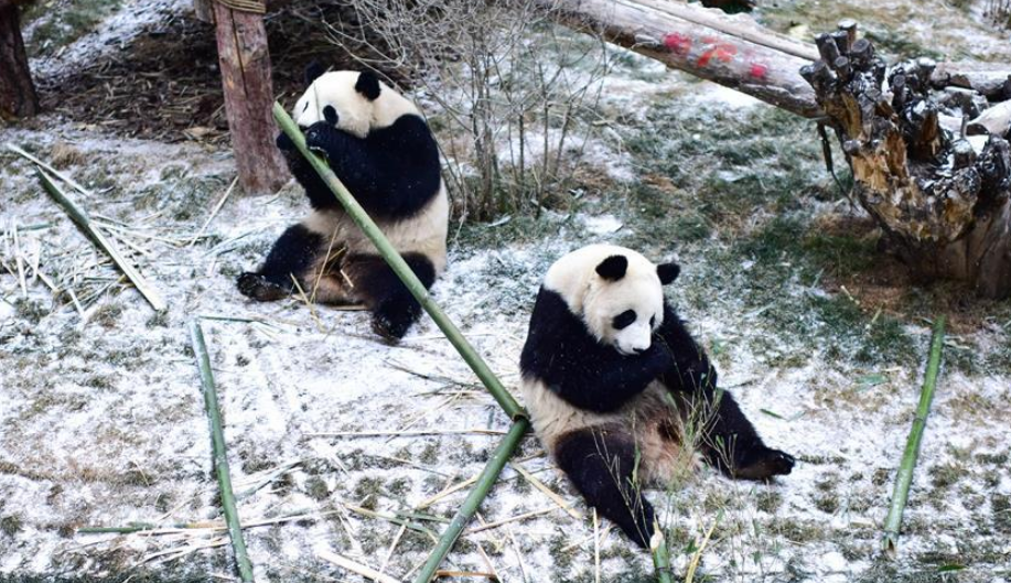 當(dāng)日,青海省西寧市迎來降雪,西寧熊貓館四只“萌寵”大熊貓在雪天里享受著吃竹子的樂趣。