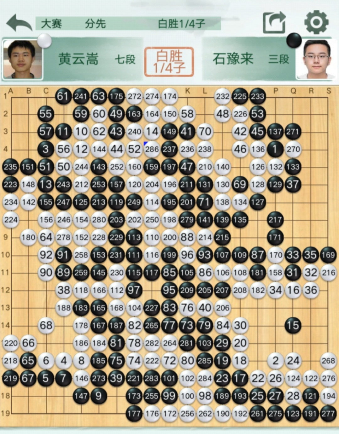 緊接著,連勝柁嘉熹、連笑兩位頂尖九段的石豫來三段執(zhí)黑對黃云嵩七段,雙方大戰(zhàn)286手,局面細(xì)膩,勝負(fù)天平一直在左右擺晃,收官時石豫來出現(xiàn)了致命的失誤,最終小石以四分之一子惜敗于黃云嵩。
