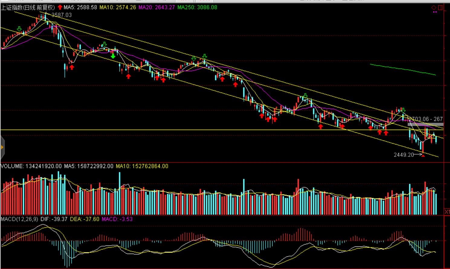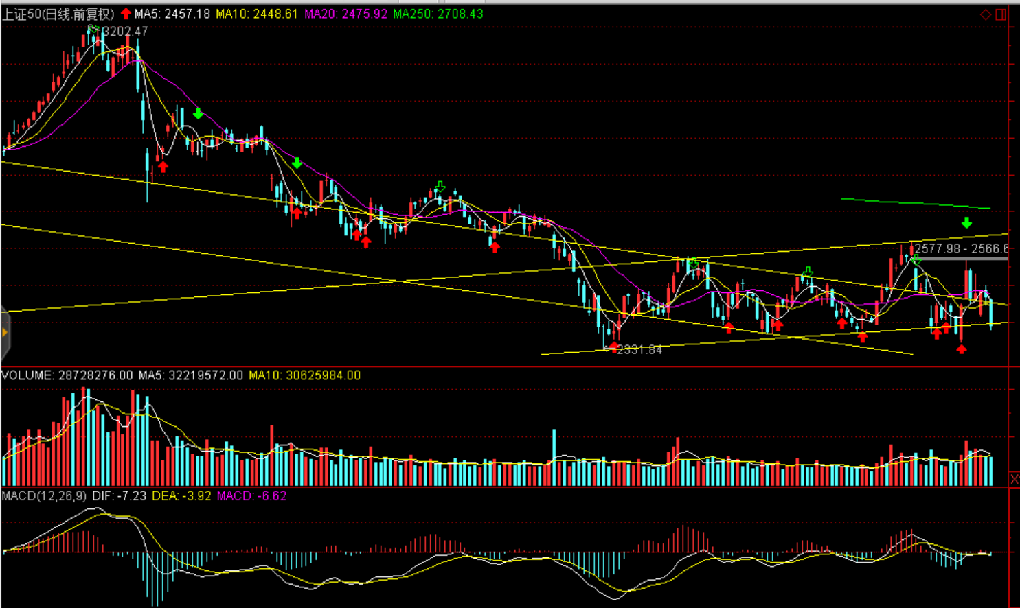 周一兩市股指全天震蕩下跌,股指均報收中陰線。上證50跌3.21%報2389.58點,滬綜指收跌2.18%報2542.1點,深證成指跌2.43%報7322.24點,創(chuàng)業(yè)板指跌1.01%報1250.48點。兩市僅成交2554億元,環(huán)比減少271億元,北上資金今日逆勢凈流入逾29億元。盤面看白酒領(lǐng)跌大消費白馬,茅臺跌停引發(fā)蝴蝶效應(yīng),食品、家電、醫(yī)藥聯(lián)袂大幅下跌,資金集中流出消費白馬。